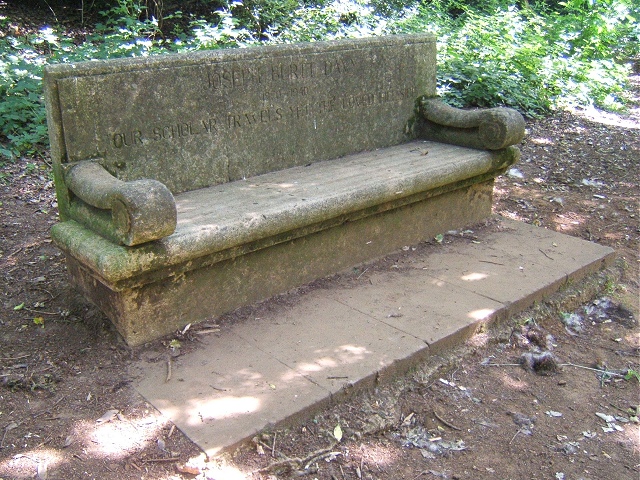 Cast concrete bench with arms and a paved area in front. Originally had a wood lath seat which has now rotted away. When first erected, the seat commanded a vista to the south west but this is now obscured by a stand of trees: