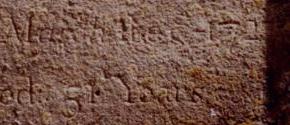 | With many old stones, the inscription has almost completely worn away over the years, and only the shallowest of indentations remains. Under most lighting conditions these are imperceptable. However if you are lucky enough to get direct sunlight grazing the surface of the stone, even the faint remaining indentations cast shadows which suddenly leap out at you and are easily read. The example shown here demonstrates the point. The portion of this early 18th century stone that is in sunlight, is readable (as shown by the magnified detail below), whilst nothing is visible on the portion that is in shadow. The obliqueness of the sun's rays may be judged from the length of the shadows cast on the shallow depressed surface created for the inscription. The angle of the sun is just right for only about 10 minutes a day, not allowing for the cloud which always appears at the worst possible moment! |